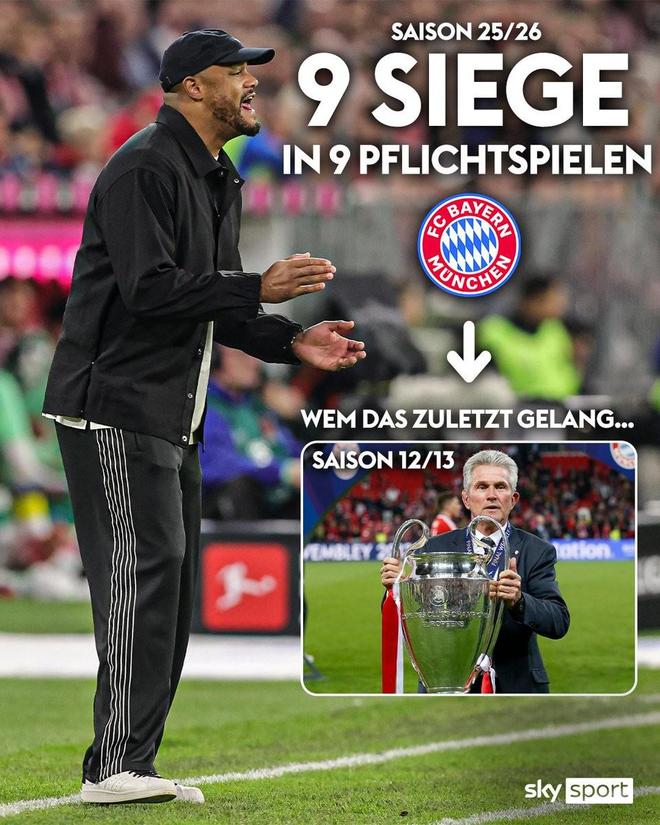 據統計,拜仁在新賽季前9場比賽中保持全勝,他們上一次取得這樣出色的開局要追溯到2012-13賽季,那個賽季海因克斯帶領拜仁贏得歐冠、德甲、德國杯三冠王。